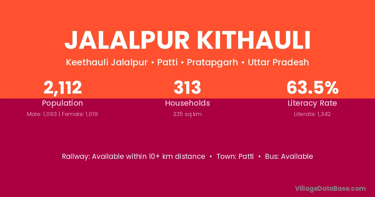 Jalalpur Kithauli village has a total population of 2,112 people, of which 1,093 are males and 1,019 are females.