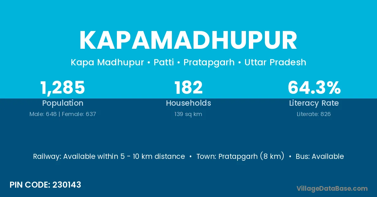 Pratapgarh (8 km) is the nearest town to Kapamadhupur village for major economic activities and is located approximately 8 km away.