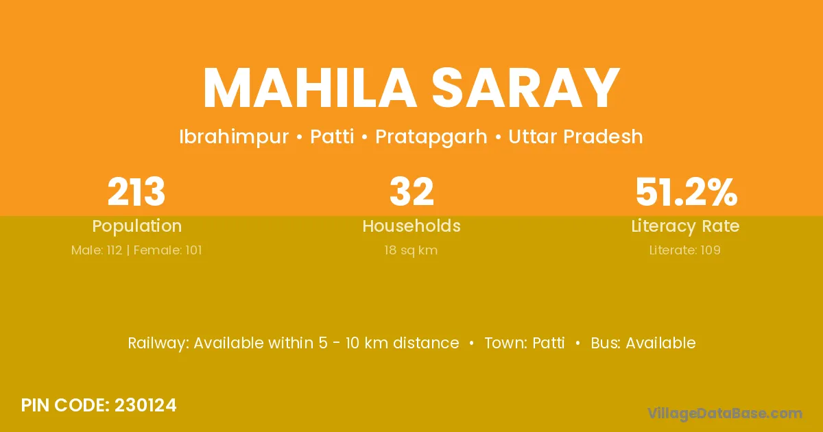 Mahila Saray village has a total population of 213 people, of which 112 are males and 101 are females.