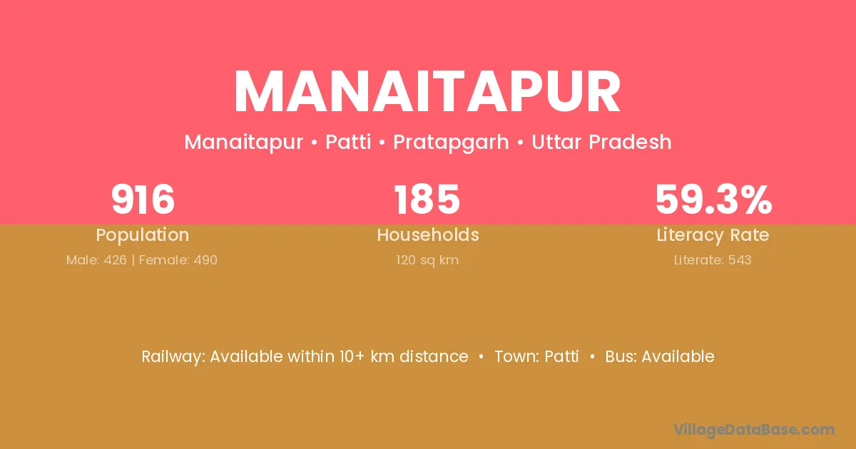 Manaitapur village has a total population of 916 people, of which 426 are males and 490 are females.