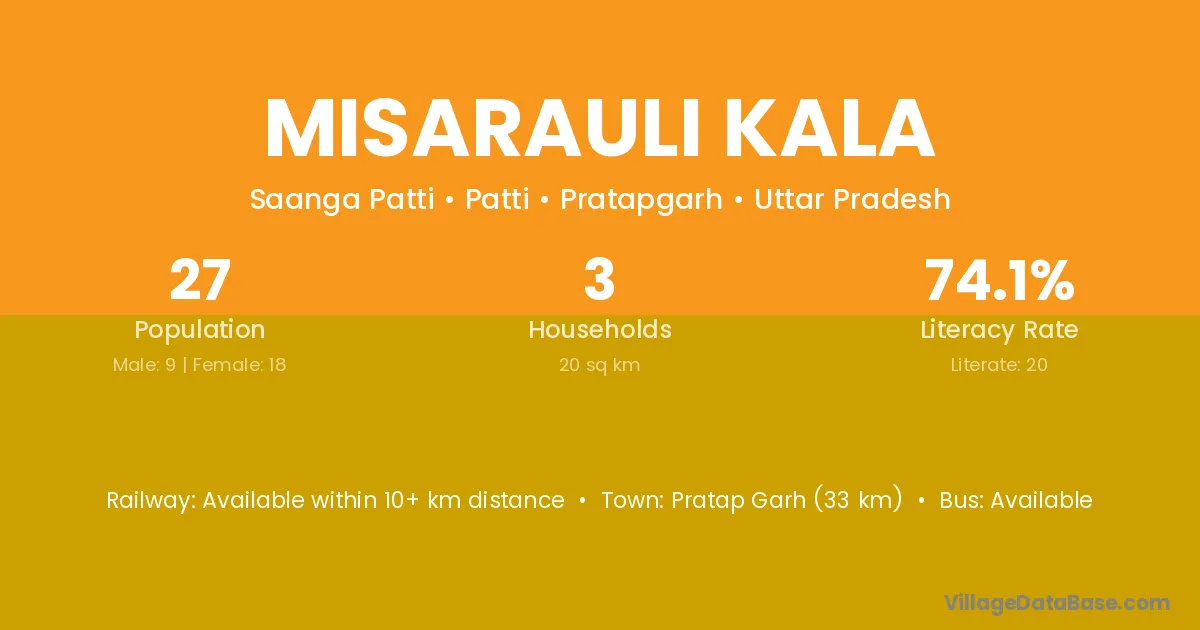 Pratap Garh (33 km) is the nearest town to Misarauli Kala village for major economic activities and is located approximately 33 km away.