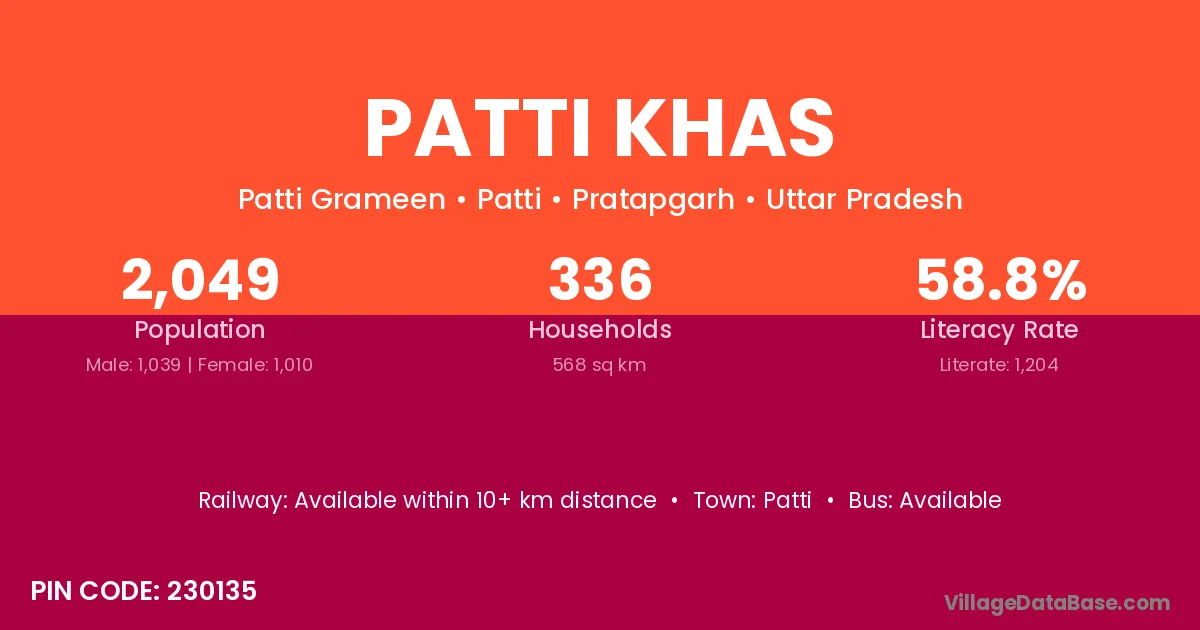 Patti Khas village has a total population of 2,049 people, of which 1,039 are males and 1,010 are females.