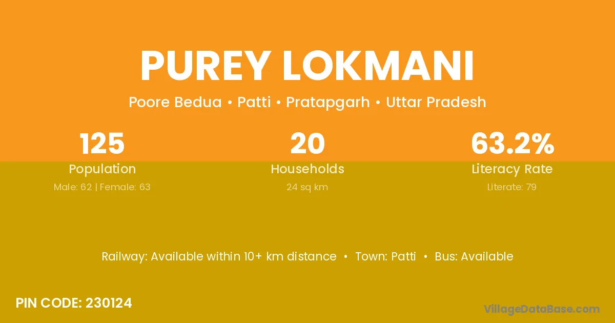 Purey Lokmani village has a total population of 125 people, of which 62 are males and 63 are females.