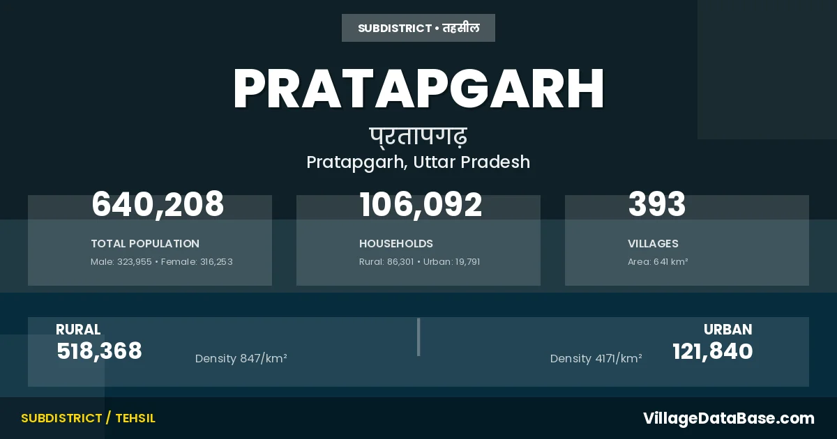 According to the 2011 census The total area of Pratapgarh Tehsil is 641 km², with a population of 640208 people. The population density is 999 inhabitants per square kilometre, and there are approximately 106092 houses in the sub district.