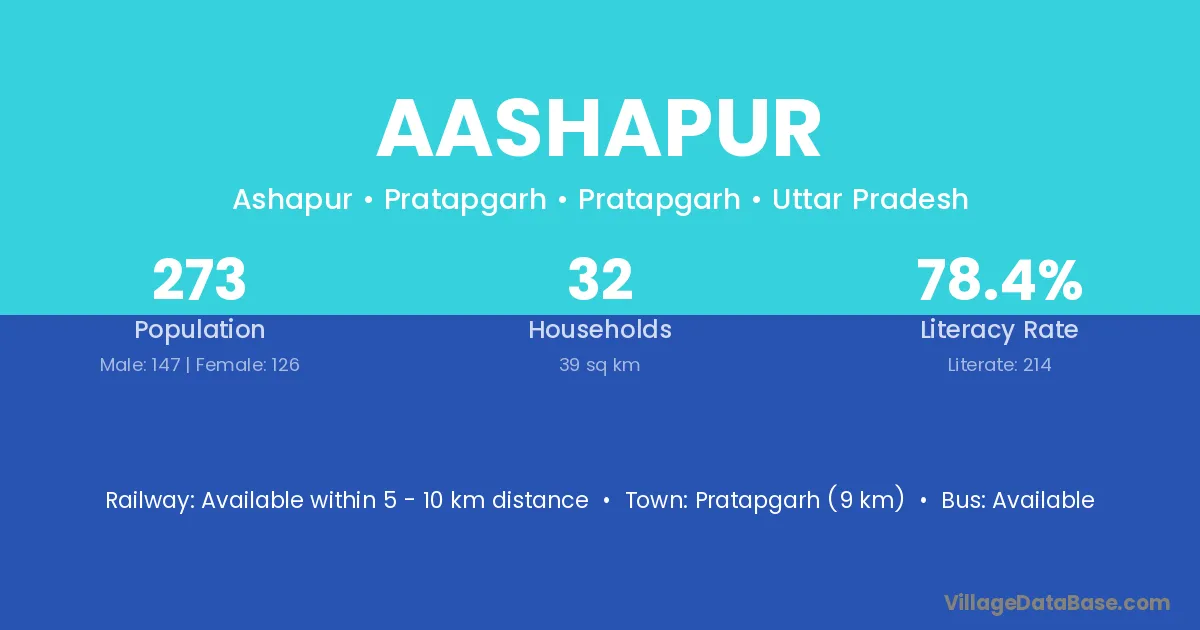 Pratapgarh (9 km) is the nearest town to Aashapur village for major economic activities and is located approximately 9 km away.