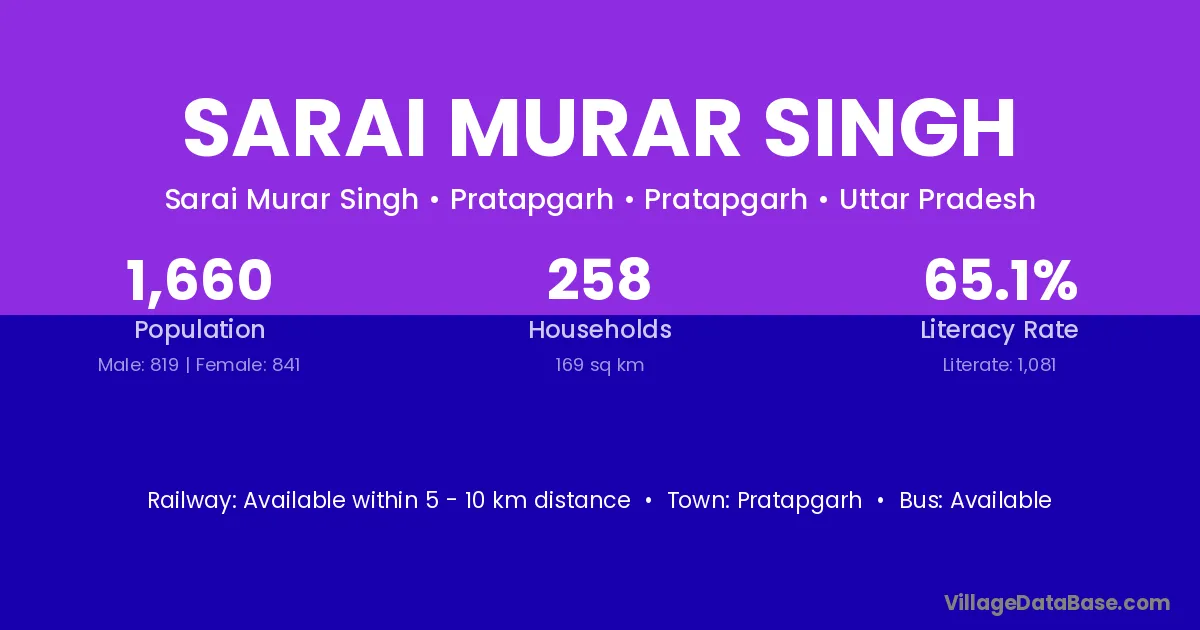 Sarai Murar Singh village has a total population of 1,660 people, of which 819 are males and 841 are females.