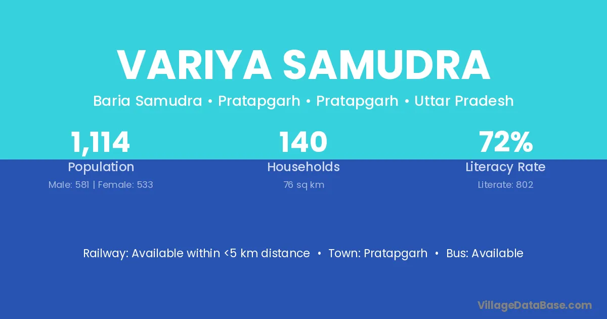 Variya Samudra village has a total population of 1,114 people, of which 581 are males and 533 are females.