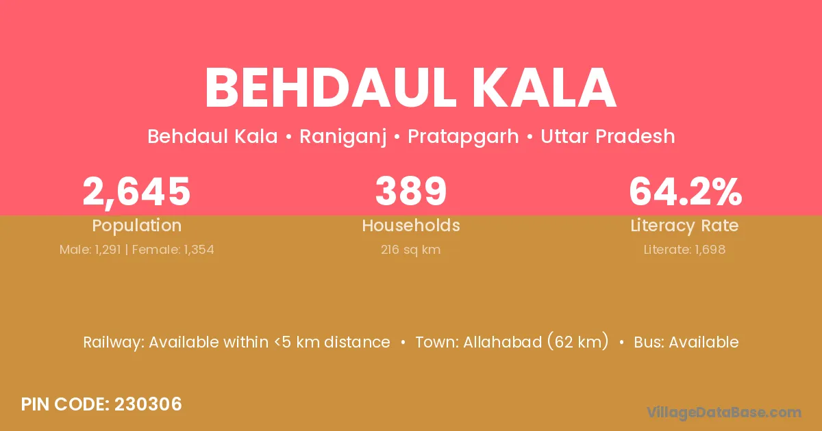 Allahabad (62 km) is the nearest town to Behdaul Kala village for major economic activities and is located approximately 62 km away.