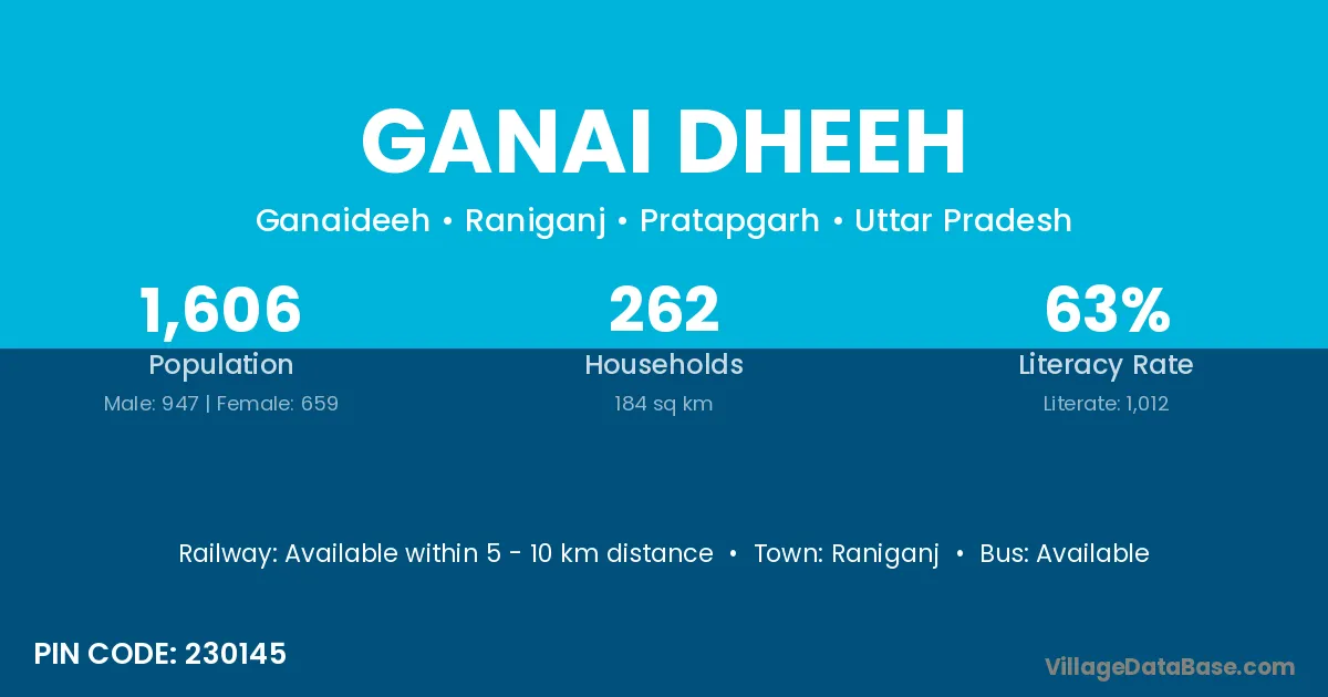 Ganai Dheeh village has a total population of 1,606 people, of which 947 are males and 659 are females.