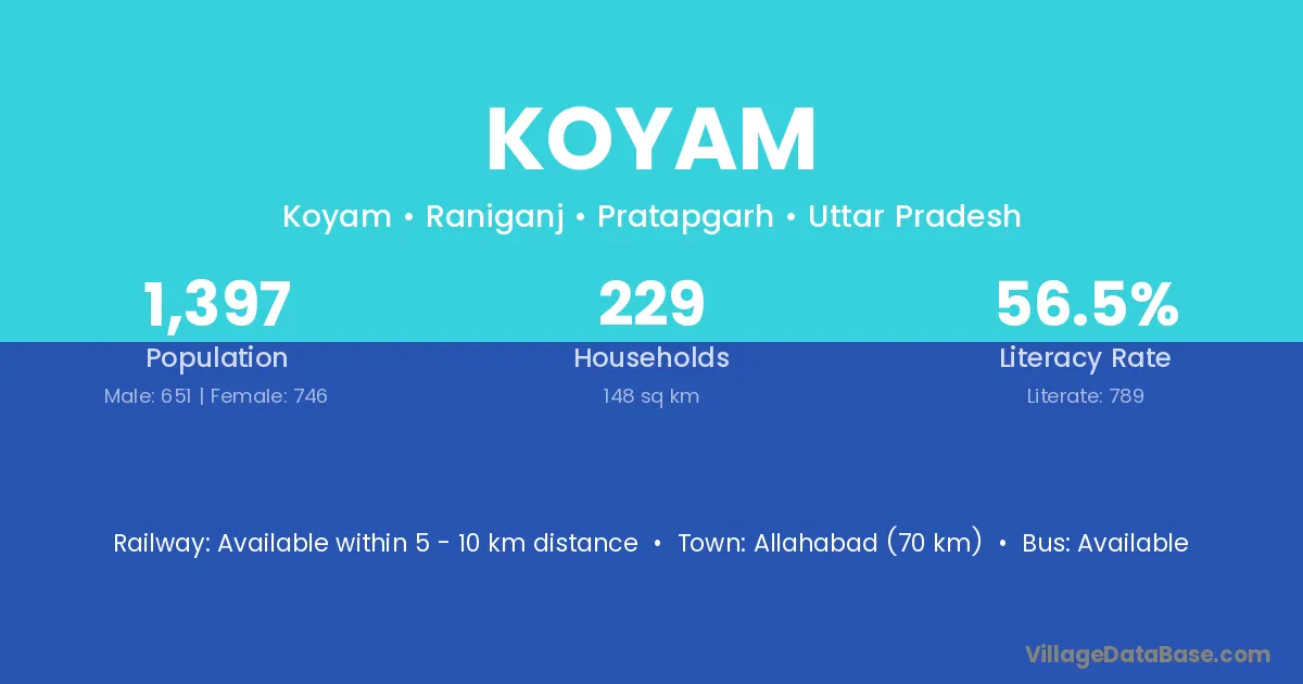 Allahabad (70 km) is the nearest town to Koyam village for major economic activities and is located approximately 70 km away.