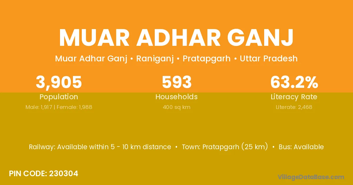 Pratapgarh (25 km) is the nearest town to Muar Adhar Ganj village for major economic activities and is located approximately 25 km away.