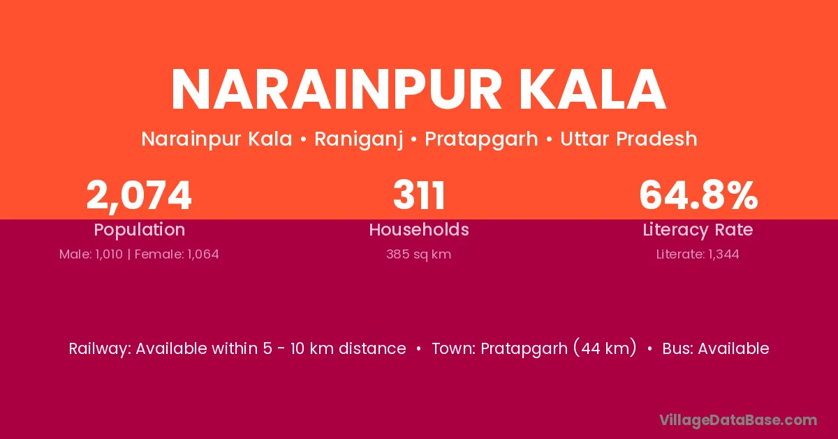 Pratapgarh (44 km) is the nearest town to Narainpur Kala village for major economic activities and is located approximately 44 km away.