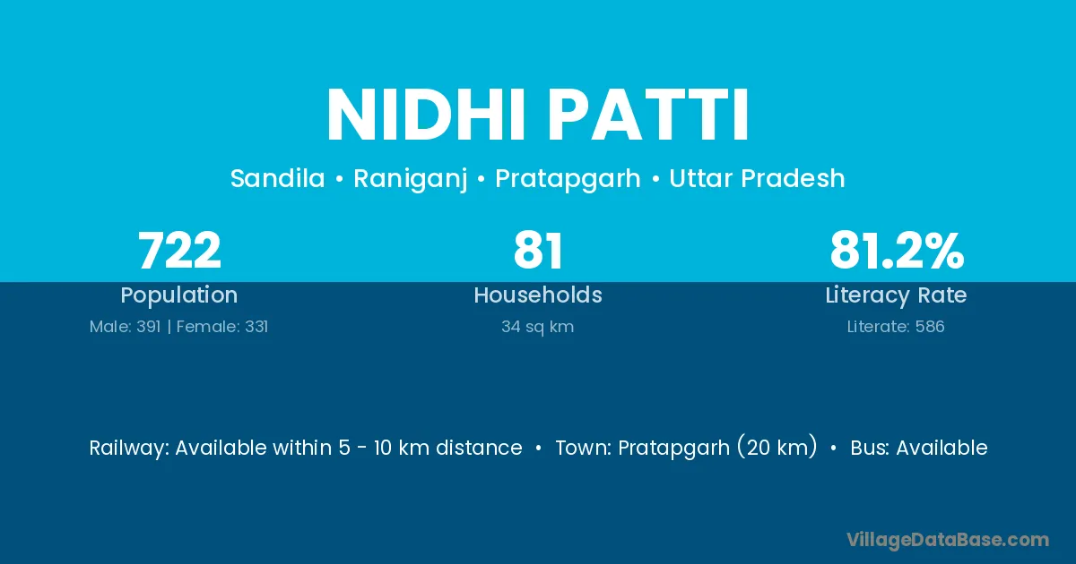 Pratapgarh (20 km) is the nearest town to Nidhi Patti village for major economic activities and is located approximately 20 km away.