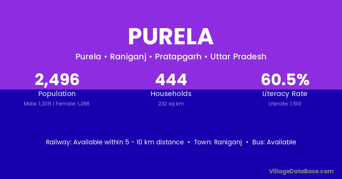 Purela village has a total population of 2,496 people, of which 1,208 are males and 1,288 are females.