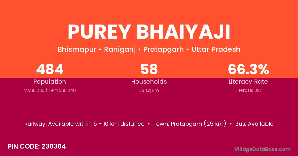 Pratapgarh (25 km) is the nearest town to Purey Bhaiyaji village for major economic activities and is located approximately 25 km away.