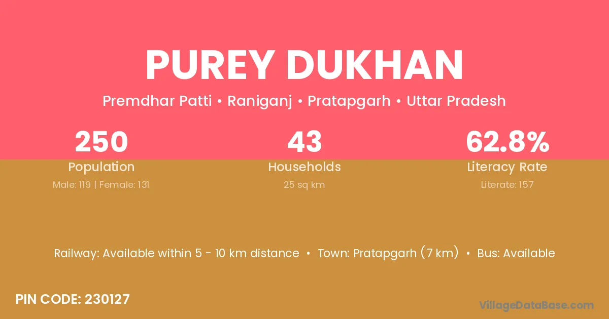 Pratapgarh (7 km) is the nearest town to Purey Dukhan village for major economic activities and is located approximately 7 km away.