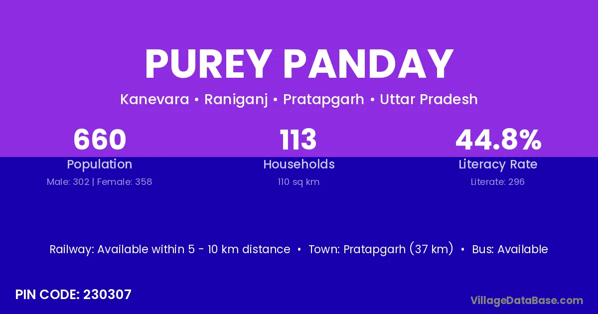 Pratapgarh (37 km) is the nearest town to Purey Panday village for major economic activities and is located approximately 37 km away.