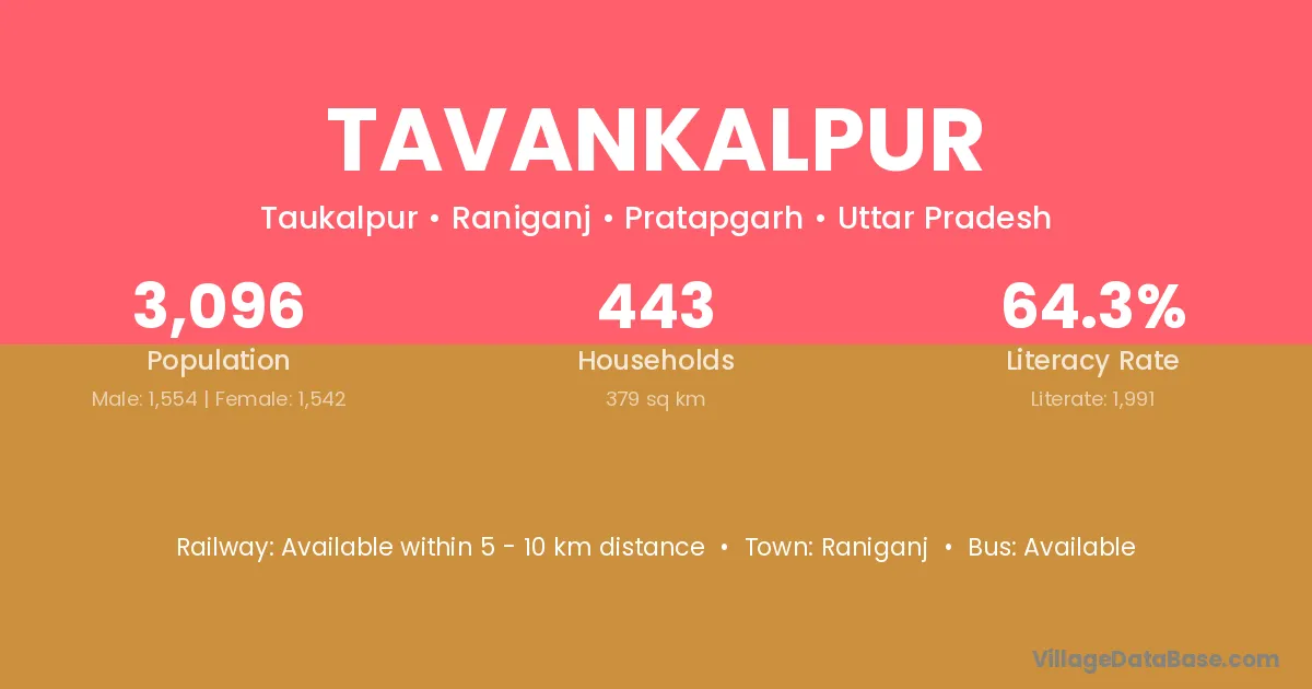 Tavankalpur village has a total population of 3,096 people, of which 1,554 are males and 1,542 are females.