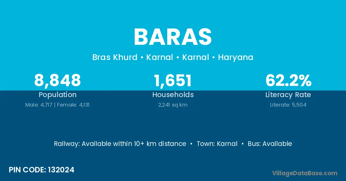 The literacy rate of Baras village is 62.61%. Male literacy stands at 72.89% and female literacy at 52.10%.