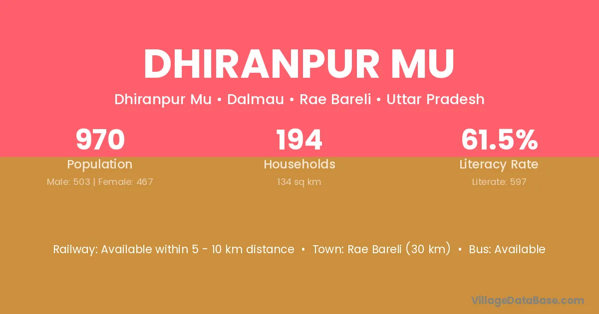 Rae Bareli (30 km) is the nearest town to Dhiranpur Mu village for major economic activities and is located approximately 30 km away.