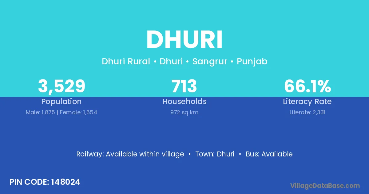 Dhuri village has a total population of 1,283 people, of which 648 are males and 635 are females.