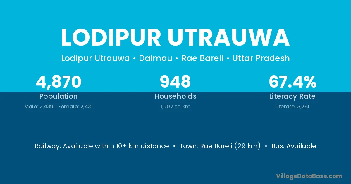 Rae Bareli (29 km) is the nearest town to Lodipur Utrauwa village for major economic activities and is located approximately 29 km away.