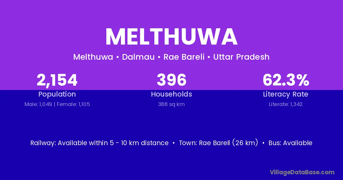 Rae Bareli (26 km) is the nearest town to Melthuwa village for major economic activities and is located approximately 26 km away.