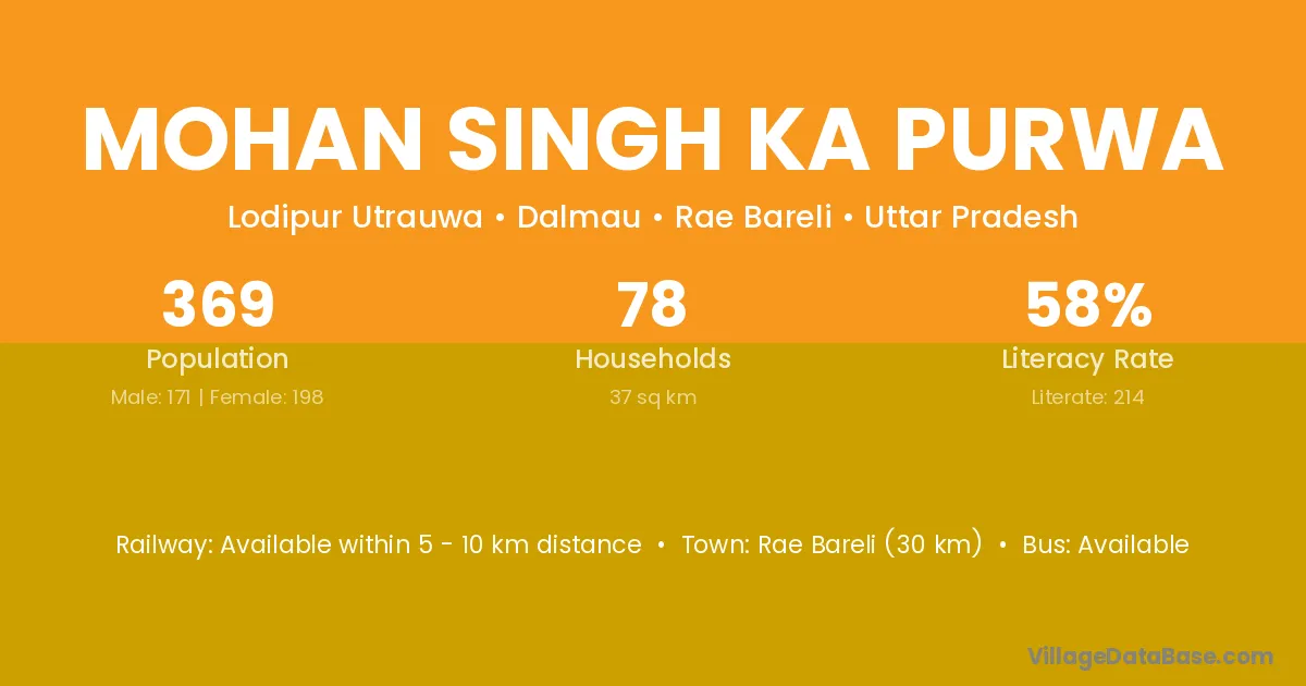 Rae Bareli (30 km) is the nearest town to Mohan Singh Ka Purwa village for major economic activities and is located approximately 30 km away.
