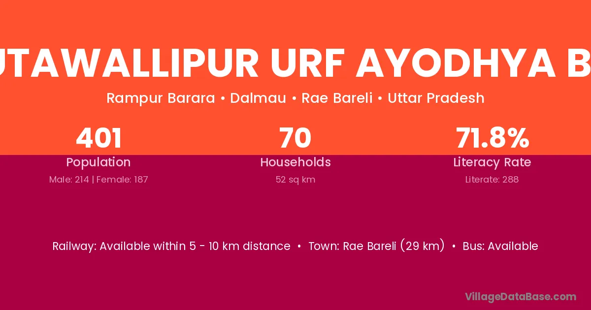 Mutawallipur Urf Ayodhya Bux village has a total population of 401 people, of which 214 are males and 187 are females.