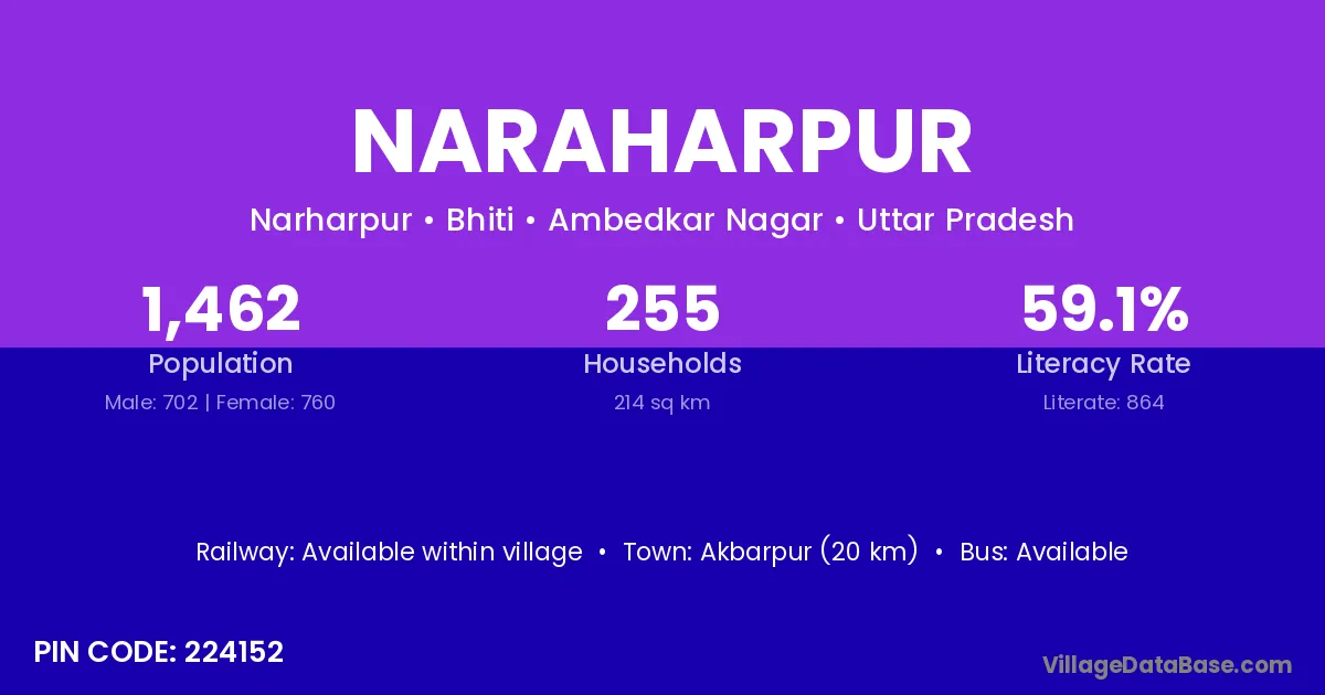 Naraharpur village has a total population of 993 people, of which 502 are males and 491 are females.