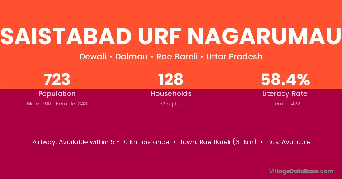 Saistabad Urf Nagarumau village has a total population of 723 people, of which 380 are males and 343 are females.