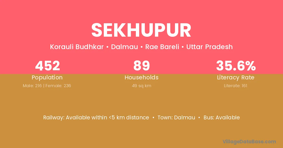 Sekhupur village has a total population of 452 people, of which 216 are males and 236 are females.