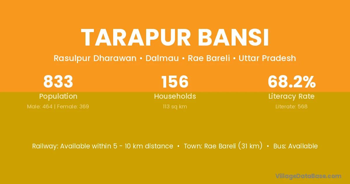 Rae Bareli (31 km) is the nearest town to Tarapur Bansi village for major economic activities and is located approximately 31 km away.