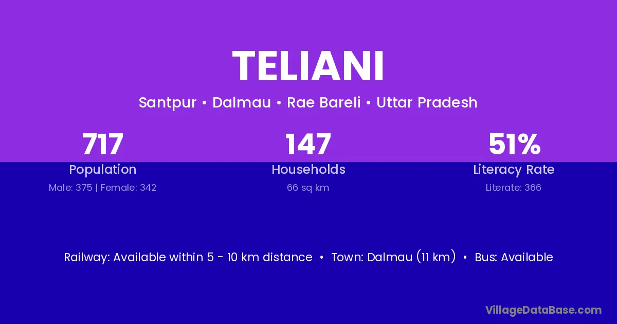 Teliani village has a total population of 717 people, of which 375 are males and 342 are females.
