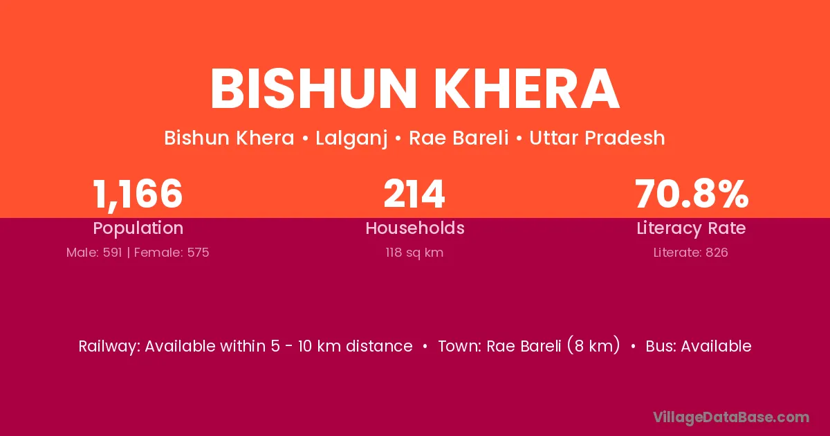 Rae Bareli (8 km) is the nearest town to Bishun Khera village for major economic activities and is located approximately 8 km away.