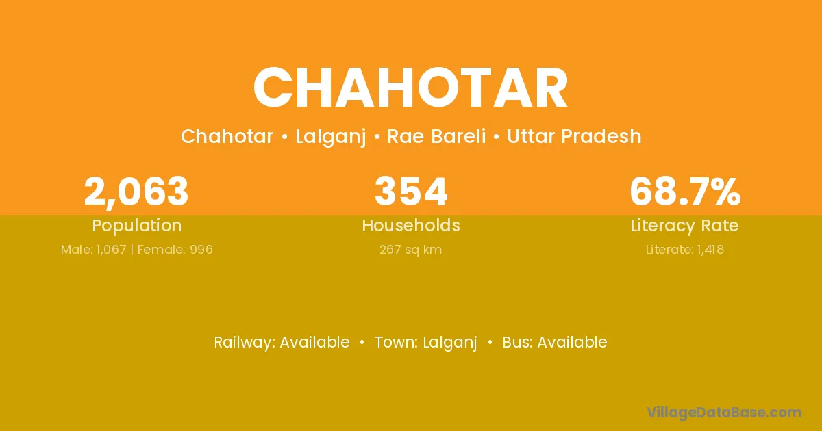 Chahotar village has a total population of 2,063 people, of which 1,067 are males and 996 are females.