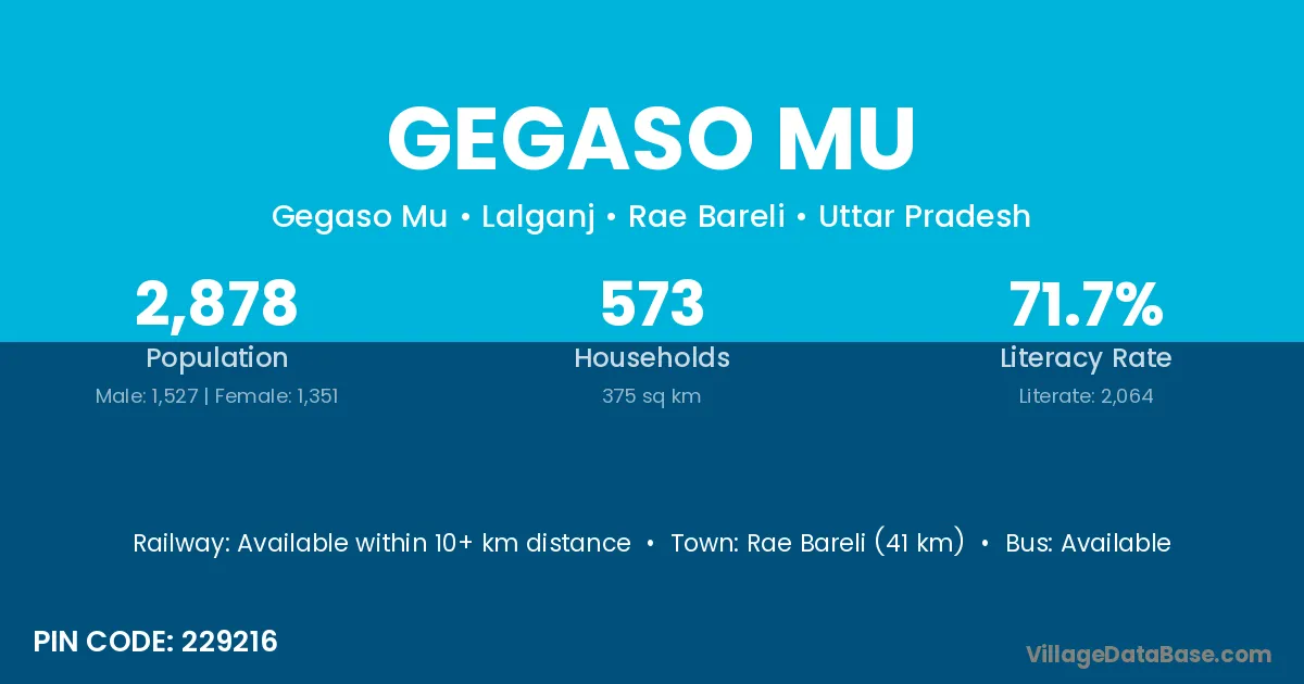 Rae Bareli (41 km) is the nearest town to Gegaso Mu village for major economic activities and is located approximately 41 km away.