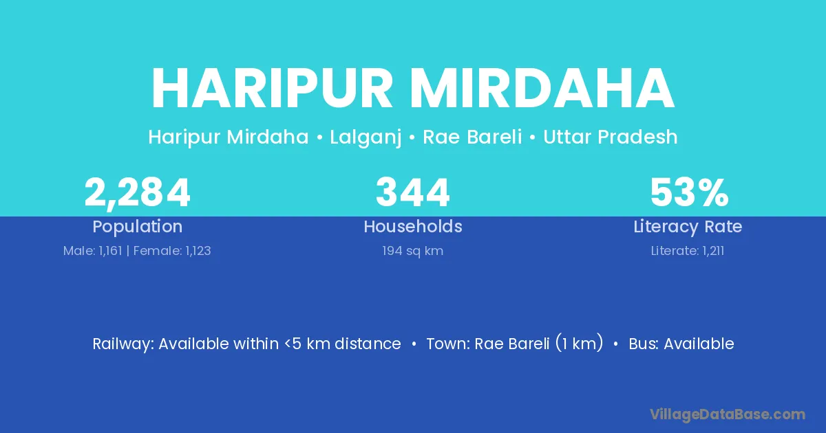 Rae Bareli (1 km) is the nearest town to Haripur Mirdaha village for major economic activities and is located approximately 1 km away.