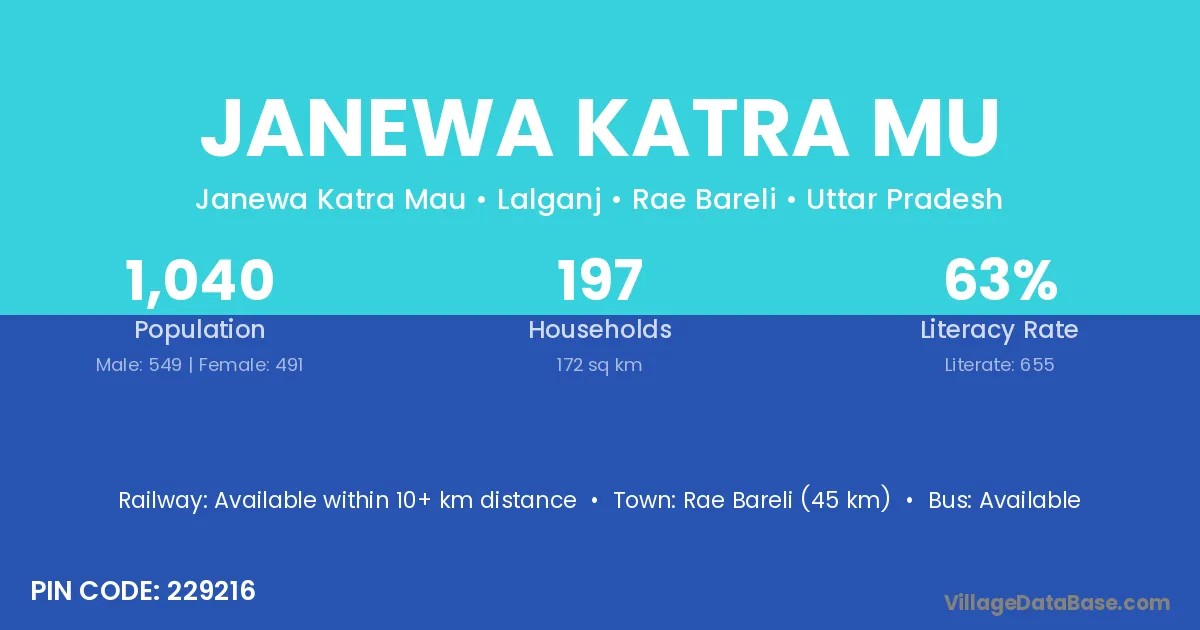 Rae Bareli (45 km) is the nearest town to Janewa Katra Mu village for major economic activities and is located approximately 45 km away.