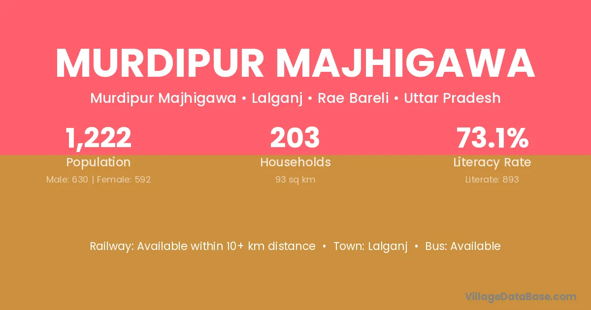 Murdipur Majhigawa village has a total population of 1,222 people, of which 630 are males and 592 are females.