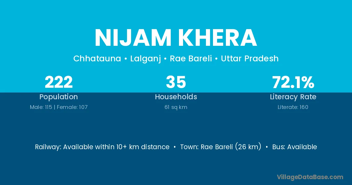 Rae Bareli (26 km) is the nearest town to Nijam Khera village for major economic activities and is located approximately 26 km away.