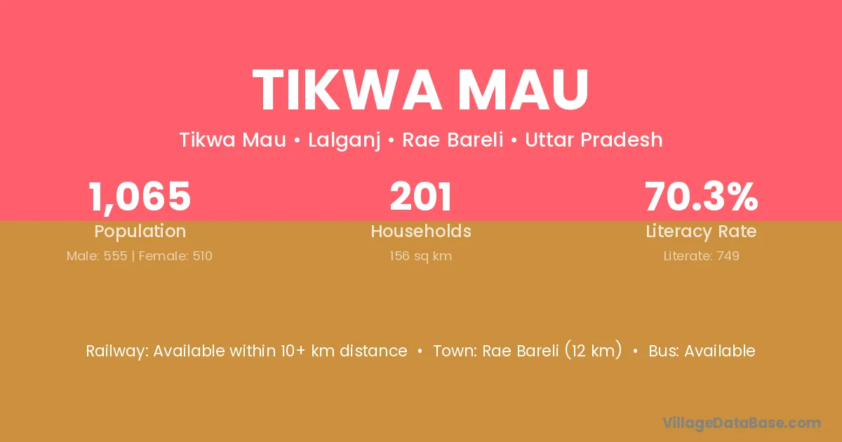Rae Bareli (12 km) is the nearest town to Tikwa Mau village for major economic activities and is located approximately 12 km away.