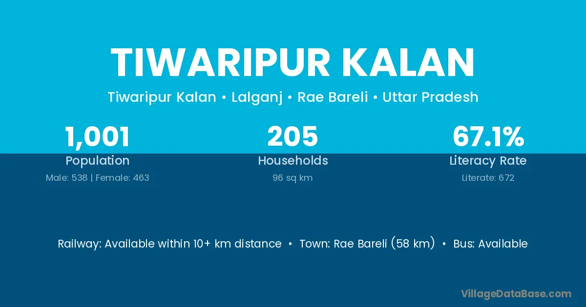 Rae Bareli (58 km) is the nearest town to Tiwaripur Kalan village for major economic activities and is located approximately 58 km away.