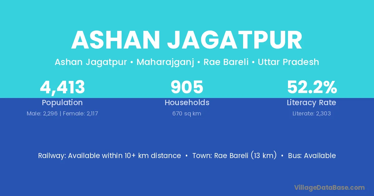 Rae Bareli (13 km) is the nearest town to Ashan Jagatpur village for major economic activities and is located approximately 13 km away.
