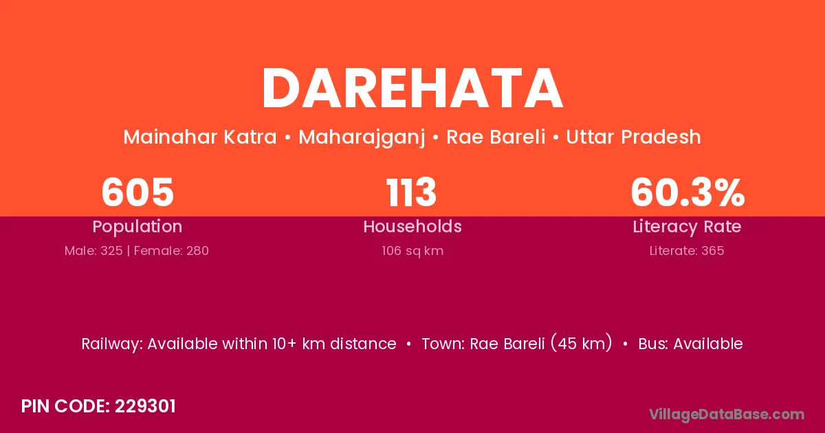 Rae Bareli (45 km) is the nearest town to Darehata village for major economic activities and is located approximately 45 km away.