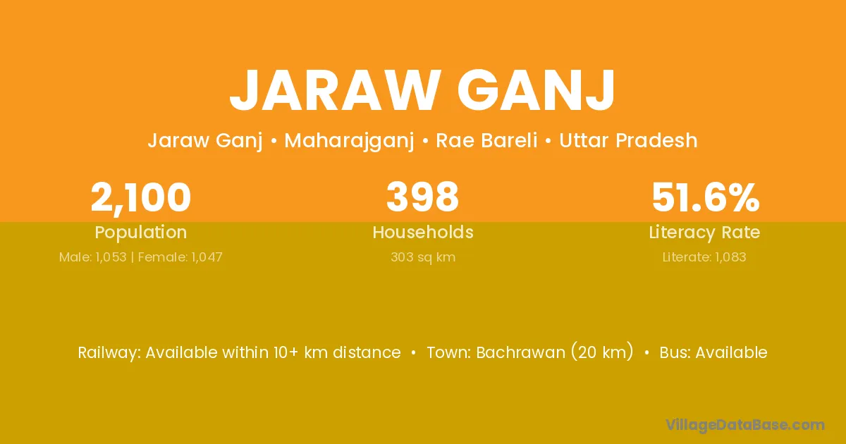 Jaraw Ganj village has a total population of 2,100 people, of which 1,053 are males and 1,047 are females.