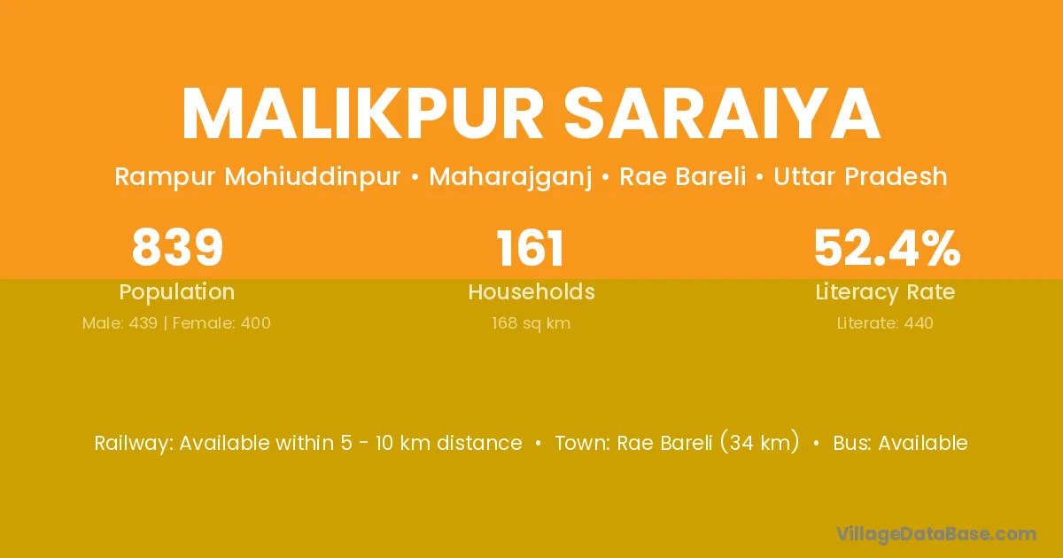Rae Bareli (34 km) is the nearest town to Malikpur Saraiya village for major economic activities and is located approximately 34 km away.