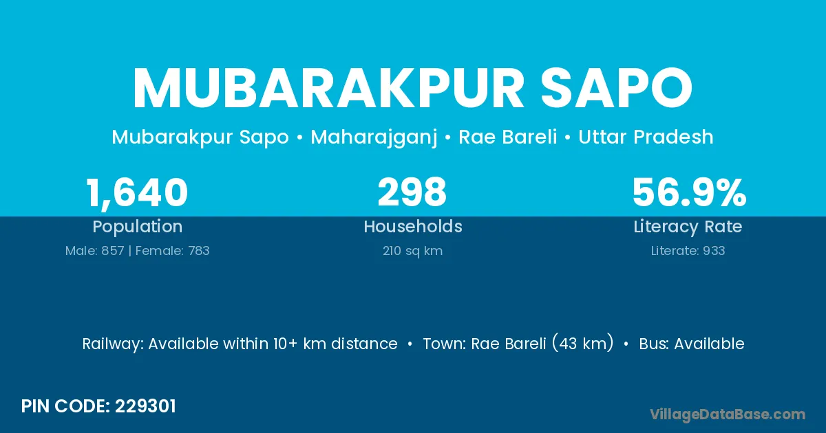 Rae Bareli (43 km) is the nearest town to Mubarakpur Sapo village for major economic activities and is located approximately 43 km away.