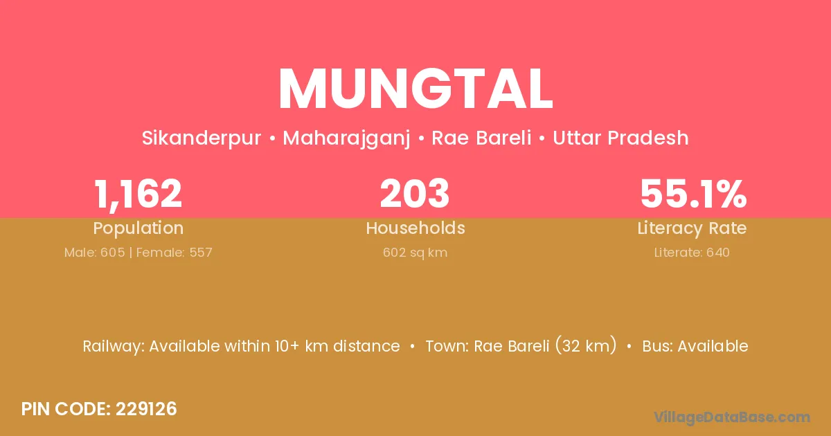 Rae Bareli (32 km) is the nearest town to Mungtal village for major economic activities and is located approximately 32 km away.