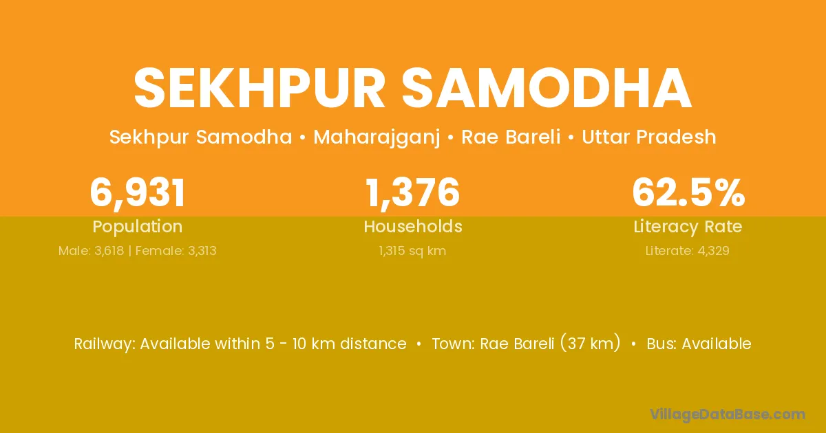 Rae Bareli (37 km) is the nearest town to Sekhpur Samodha village for major economic activities and is located approximately 37 km away.